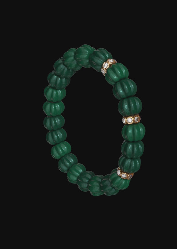Stretch bracelet with hand-carved emerald beryl beads, accented by three Victorian-inspired rondelles in 14K yellow gold, each set with rose-cut diamonds. 8mm beads. 7" length. Slips on easily.